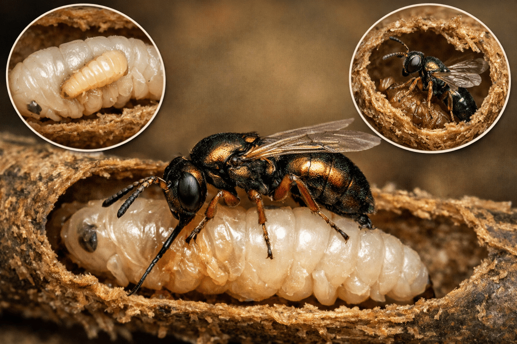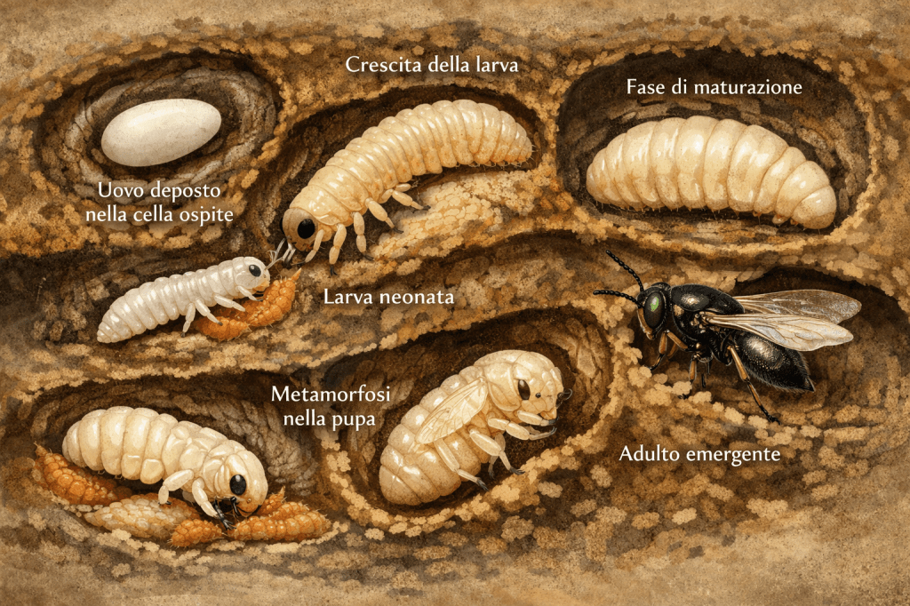 Le larve emergono e iniziano a scavare gallerie tra gli strati epidermici, nutrendosi dei tessuti fotosintetici. Alcune specie di Caloptilia completano inizialmente il ciclo come minatrici e successivamente passano a costruire pieghe fogliari o sacche protettive. La fase larvale dura generalmente 2–3 settimane, seguita dalla fase pupale, spesso protetta all’interno della foglia o in case di seta, prima della comparsa dell’adulto.