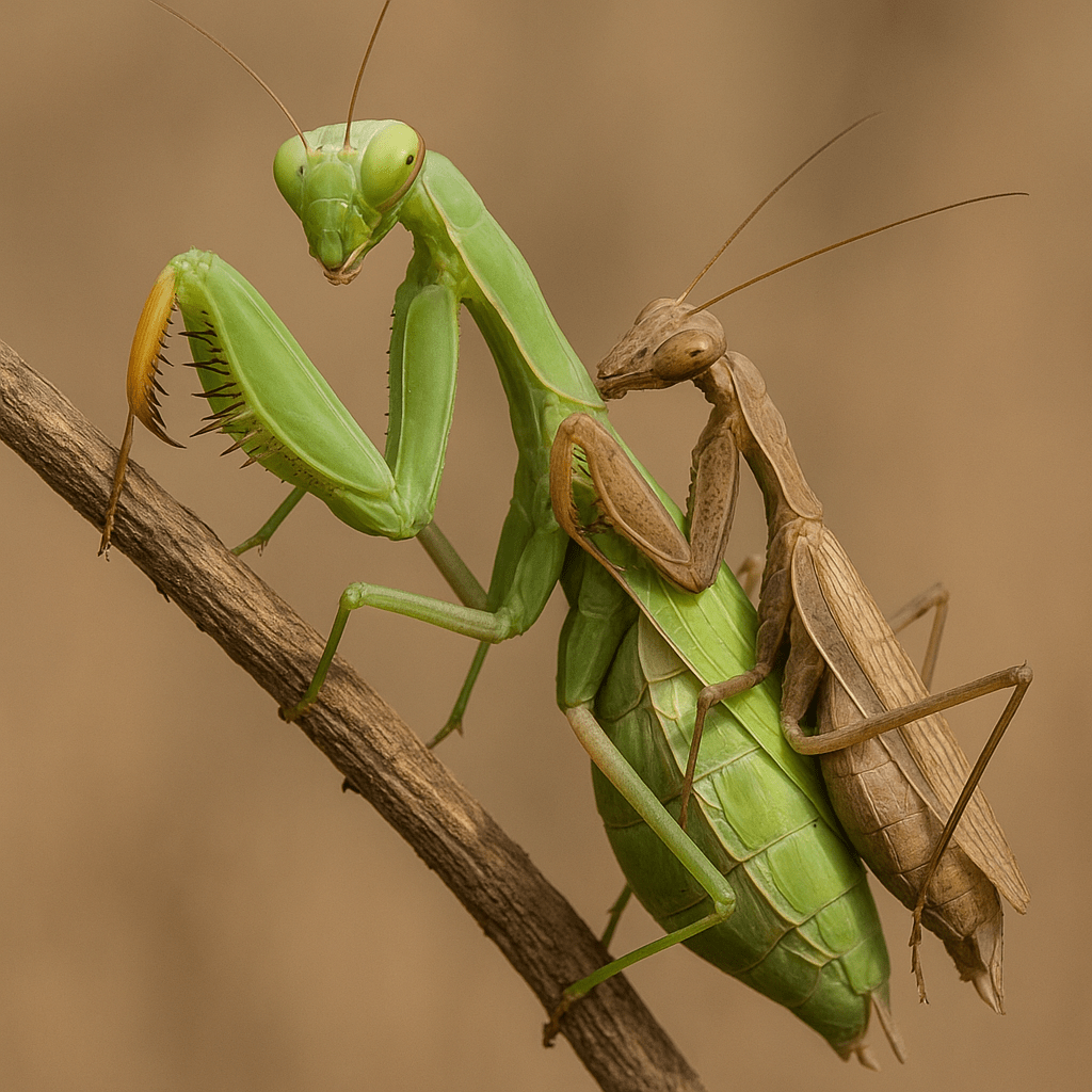 The mantis is an opportunistic predator: it feeds on flies, grasshoppers, bees, butterflies, and even other mantises. It waits motionless among vegetation and strikes with lightning speed. It can camouflage perfectly into its surroundings, remaining invisible until the moment of attack.