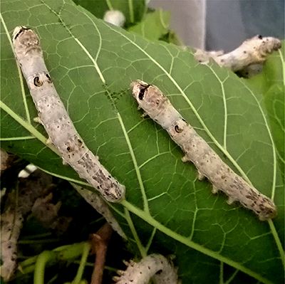 EN: Silkworms feed exclusively on mulberry leaves (Morus spp.), preferably white mulberry. A larva can consume up to 50 times its own weight. A healthy and abundant diet is crucial for the production of quality cocoons.