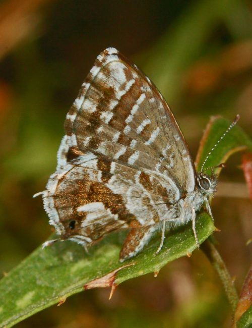 The geranium moth (Cacyreus marshalli) is a small butterfly, about 1.5–2 cm long, with brownish-grey wings and fringed edges. The hindwings have a distinct white patch.