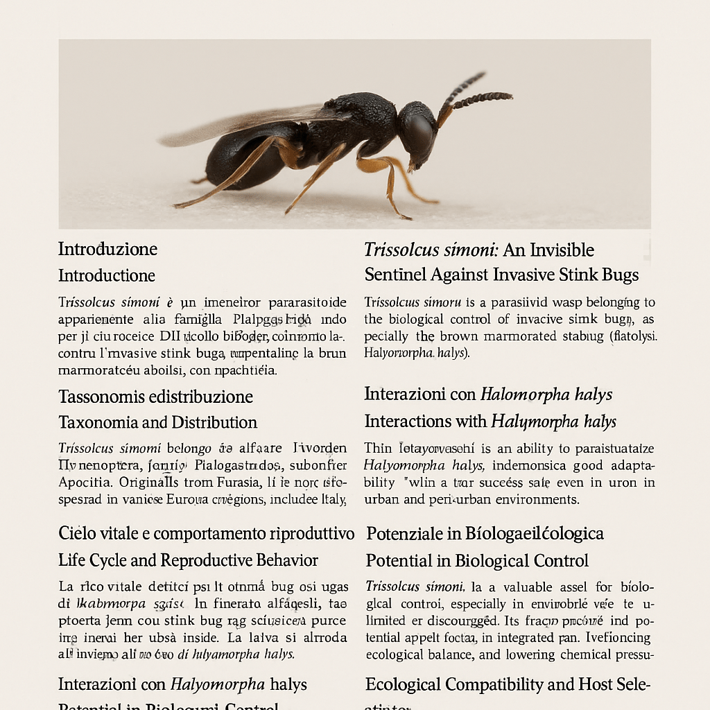 Trissolcus simoni is a silent yet crucial ally in crop protection and ecological balance. Although less known than other parasitoids, it deserves a place of honor in integrated pest management programs, especially in urban, garden, and small-scale farm contexts where pesticide use is discouraged. Investing in its knowledge and promotion means supporting more sustainable agriculture.