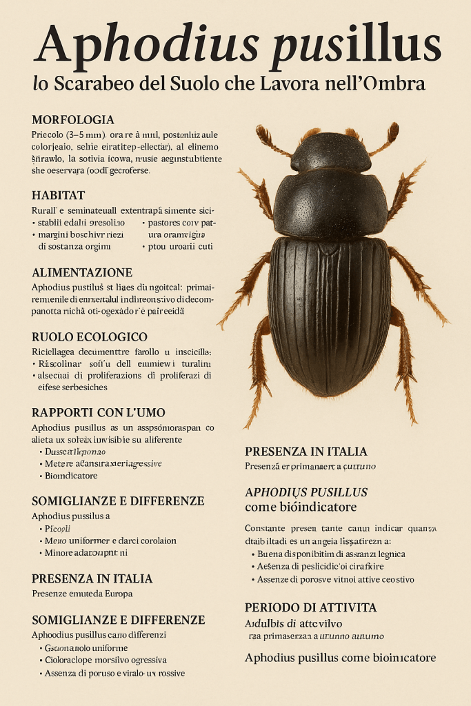 Aphodius pusillus è un piccolo scarabeo appartenente alla famiglia degli Scarabaeidae, sottofamiglia Aphodiinae, spesso ignorato per le sue dimensioni ridotte e il suo stile di vita discreto. Nonostante ciò, riveste un ruolo ecologico fondamentale nei cicli naturali dei nutrienti e nella salute dei terreni, soprattutto nei contesti agricoli, zootecnici e nei prati stabili del verde urbano e rurale.
