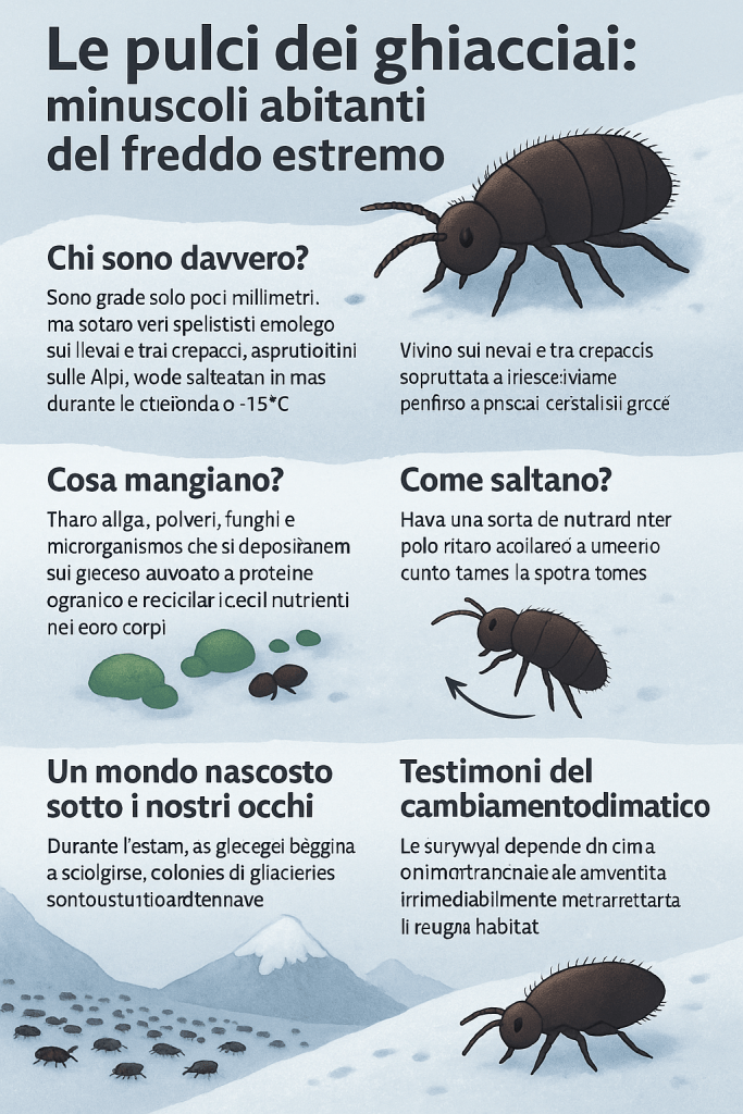 Sono grandi solo pochi millimetri, ma sono veri specialisti del freddo. Vivono sui nevai e tra i crepacci, soprattutto sulle Alpi, dove saltellano in massa durante lo scioglimento dei ghiacci. Alcune specie si sono adattate in modo così preciso da sopravvivere perfino a –15 °C, grazie a speciali proteine antigelo che impediscono la formazione di cristalli di ghiaccio nei loro corpi.