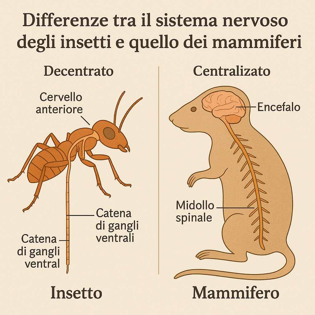 Il sistema nervoso è il centro di controllo e comunicazione di ogni organismo animale. Negli insetti e nei mammiferi, pur assolvendo funzioni simili – come la percezione dell’ambiente, il controllo dei movimenti e la regolazione delle funzioni vitali – è strutturato in modi profondamente diversi. Queste differenze riflettono l’evoluzione divergente dei due gruppi, l’adattamento a scale corporee differenti e modalità di vita completamente distinte.