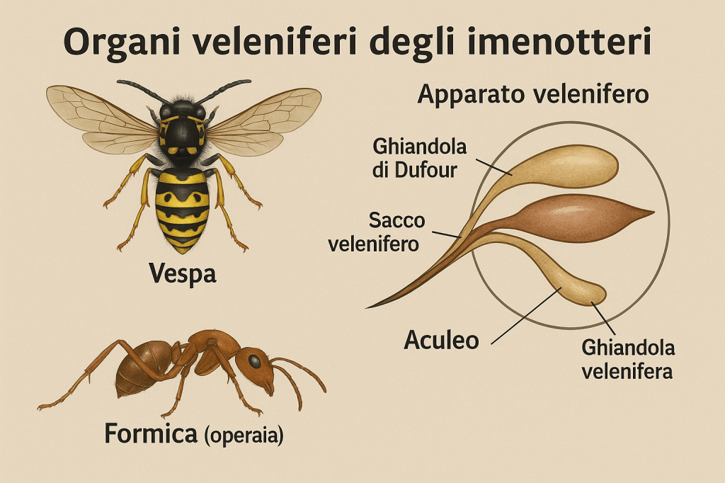 Gli organi veleniferi degli Imenotteri derivano da modificazioni evolutive dell’ovopositore, un organo ancestrale destinato originariamente alla deposizione delle uova. Nelle specie che possiedono un pungiglione, l’ovopositore si è trasformato in un aculeo cavo, collegato a una ghiandola velenifera.