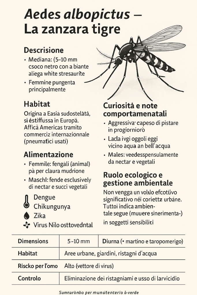 Caratteristica Dettaglio Dimensioni 5–10 mm Attività Diurna (mattina e tardo pomeriggio) Habitat Aree urbane, giardini, ristagni d’acqua Rischio per l’uomo Alto (vettore di virus) Controllo Eliminazione dei ristagni e uso di larvicidi