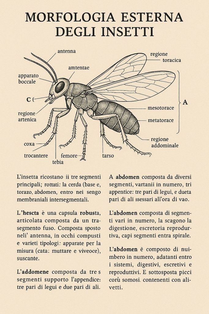 Conoscere la morfologia esterna degli insetti è il primo passo per l’entomologo, il naturalista, il giardiniere e il tecnico del verde. Ogni dettaglio – dal tipo di antenna al colore delle ali – racconta l’evoluzione, l’ecologia e il comportamento dell’insetto. Questo manuale vuole fornire un riferimento chiaro, pratico e completo per affrontare con consapevolezza lo studio e l’osservazione degli insetti.