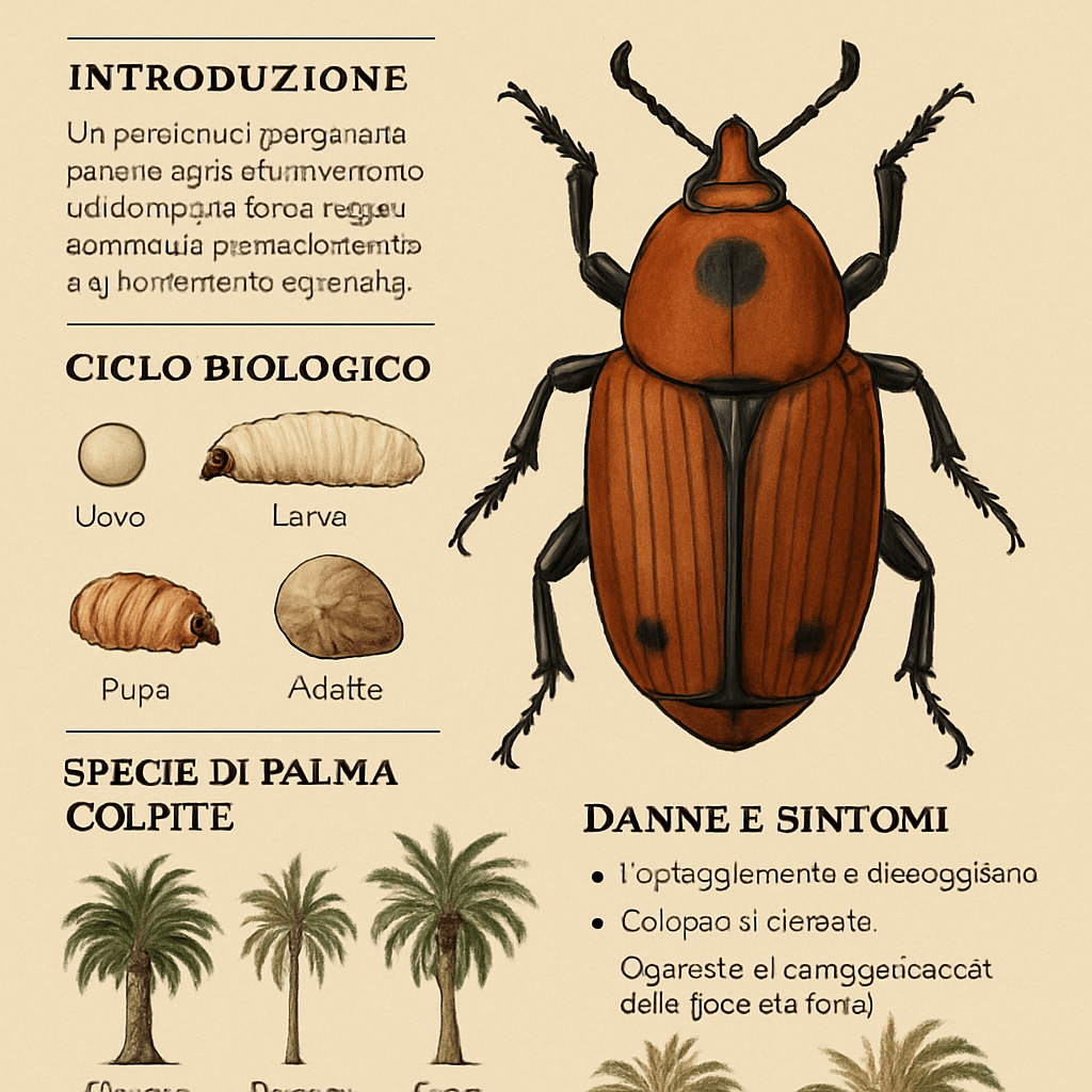 Originario dell’Asia meridionale, si è diffuso rapidamente a causa del commercio internazionale di palme ornamentali e da frutto, portando con sé un impatto devastante su piante, paesaggi e settori economici legati al turismo e all’agricoltura.