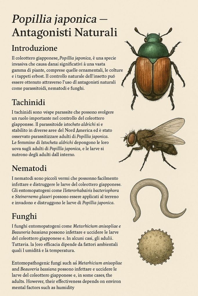 Managing Popillia japonica requires an integrated approach combining knowledge of natural enemies, targeted application of biological agents, and sustainable agronomic practices.