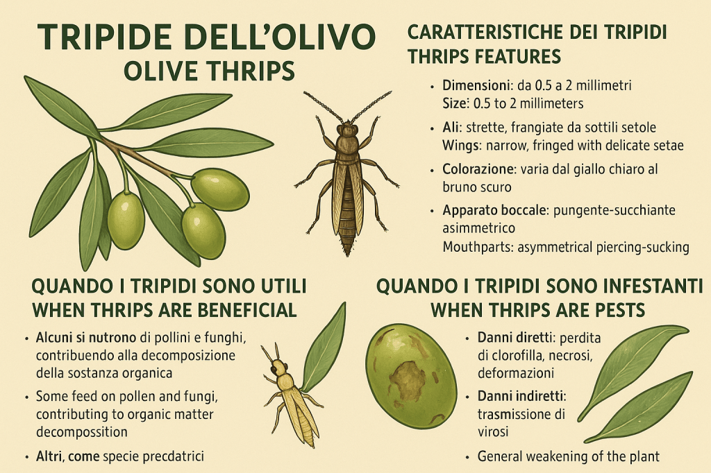 EN – Thrips are multifaceted insects: small and seemingly insignificant, yet they decisively influence crop health and ecosystem stability. The olive thrips, if left unmanaged, can severely compromise production, but at the same time, other thrips species may be beneficial as predators or pollinators. Early recognition of symptoms, population monitoring, and integrated management strategies are the key to coexisting with these insects while balancing biodiversity and agricultural productivity.