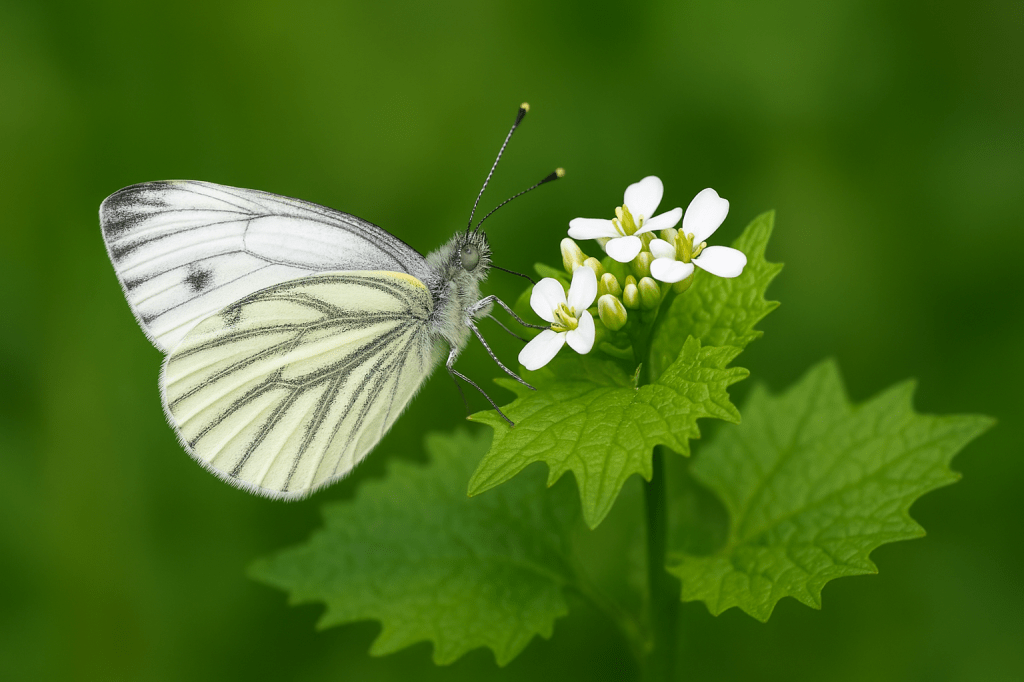 EN – The wingspan of the Green-veined White ranges from 35 to 50 mm. The upper side of the wings is white with black spots, especially in females, while the underside displays the characteristic greenish or grayish veins, which provide camouflage. The antennae are clubbed, and the body is covered in tiny scales that give it a velvety appearance.