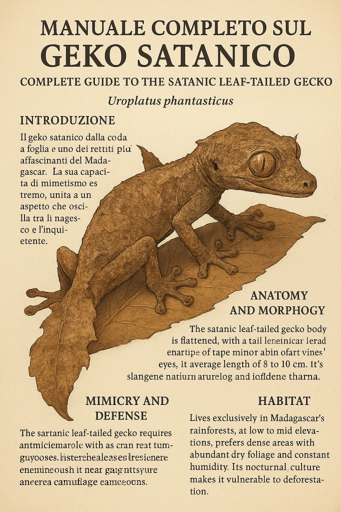 IT – Il geko satanico dalla coda a foglia è uno dei rettili più affascinanti del Madagascar. La sua capacità di mimetismo estremo, unita a un aspetto che oscilla tra il fiabesco e l’inquietante, lo rende un vero capolavoro dell’evoluzione. Questo manuale esplora anatomia, comportamento, habitat, allevamento in cattività e curiosità culturali legate a questa specie.