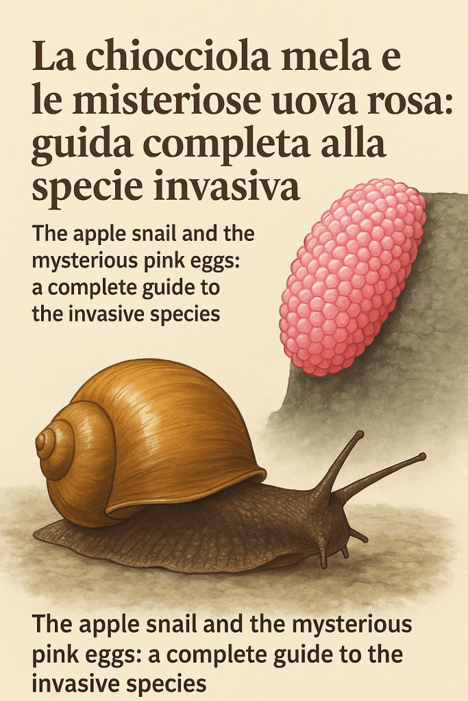 Imagine standing near a canal, an artificial pond, or even a damp garden, and spotting a compact cluster of tiny bright pink spheres clinging to a wall or a stone. They are neither fungus nor algae: they are the eggs of one of the world’s most feared freshwater snails, the so-called apple snail (Pomacea canaliculata and related species). This creature, seemingly harmless, is in fact at the center of one of the most problematic biological invasions affecting agriculture and aquatic ecosystems.
