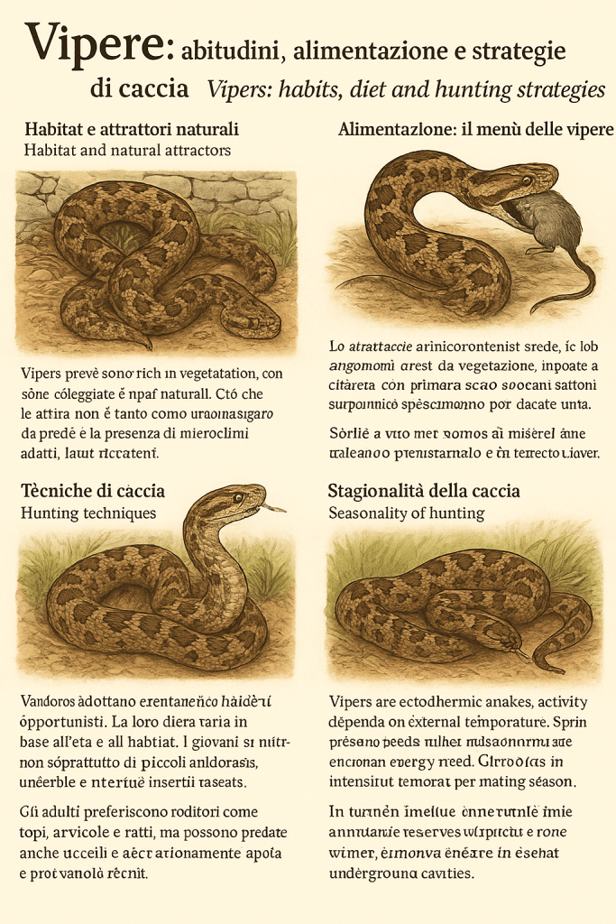Vipers are among the most fascinating and feared snakes in Europe. In Italy, their ecological role is crucial: they regulate populations of small mammals and contribute to natural balance. However, many legends and fears surround them, often exaggerated. Understanding what attracts them, what they eat, and how they hunt helps reduce the risks of unwanted encounters and appreciate their biological importance.