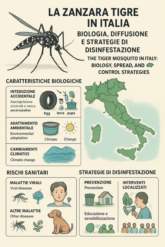 The tiger mosquito, Aedes albopictus, originally from Southeast Asia, has rapidly spread in Italy over the past decades. Its presence is now stable across many regions, with particularly high infestations in urban, suburban, and rural areas near water sources. This insect is not only a nuisance but also a potential health risk, requiring targeted and integrated management strategies.