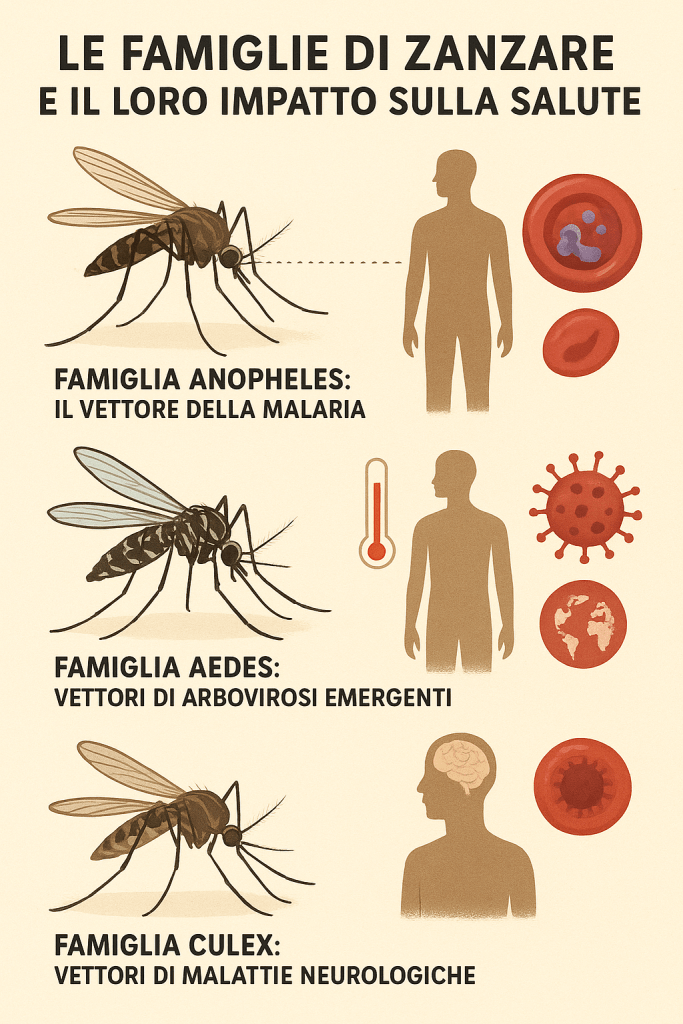Le zanzare sono tra gli insetti più noti e temuti al mondo, non tanto per il loro morso fastidioso, quanto per la loro capacità di trasmettere malattie pericolose. Appartenenti alla famiglia Culicidae, le zanzare comprendono migliaia di specie, ma solo alcune sono vettori significativi di patogeni. I generi principali che meritano attenzione sono Anopheles, Aedes e Culex.