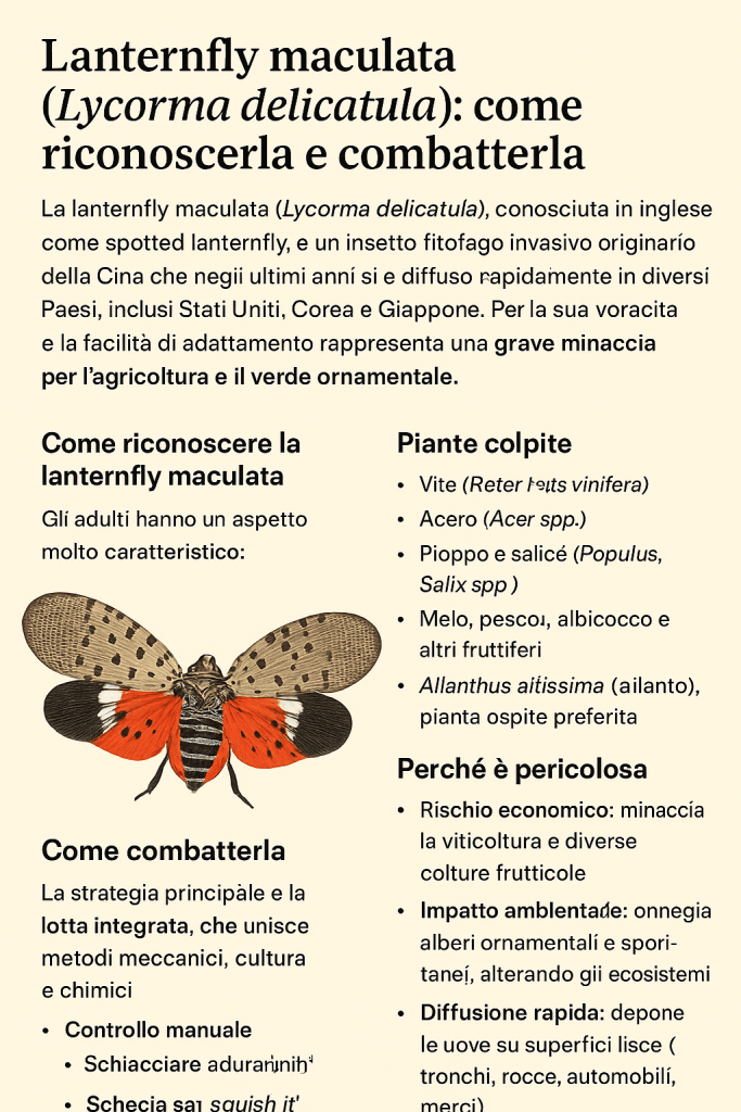 La lanternfly maculata è un nemico silenzioso ma devastante per piante ornamentali, frutteti e vigneti. Riconoscerla in tempo e agire subito è fondamentale per limitarne la diffusione. Ogni singolo intervento, anche manuale, può fare la differenza nella lotta contro questo insetto invasivo.