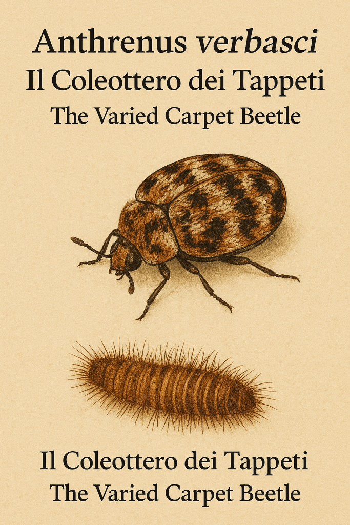 Il coleottero dei tappeti (Anthrenus verbasci) è un piccolo insetto che appartiene all’ordine dei Coleoptera e alla famiglia dei Dermestidae. Nonostante le sue dimensioni ridotte, tra i 2 e i 4 millimetri, rappresenta uno dei parassiti domestici più diffusi e problematici al mondo. La sua notorietà deriva dalla capacità delle larve di nutrirsi di materiali ricchi di cheratina o fibre naturali come lana, seta, pelle e piume. Se gli adulti si nutrono principalmente di polline e nettare, le larve sono invece i veri responsabili dei danni nelle case e nei musei, dove possono infestare tappeti, vestiti e persino collezioni zoologiche.
