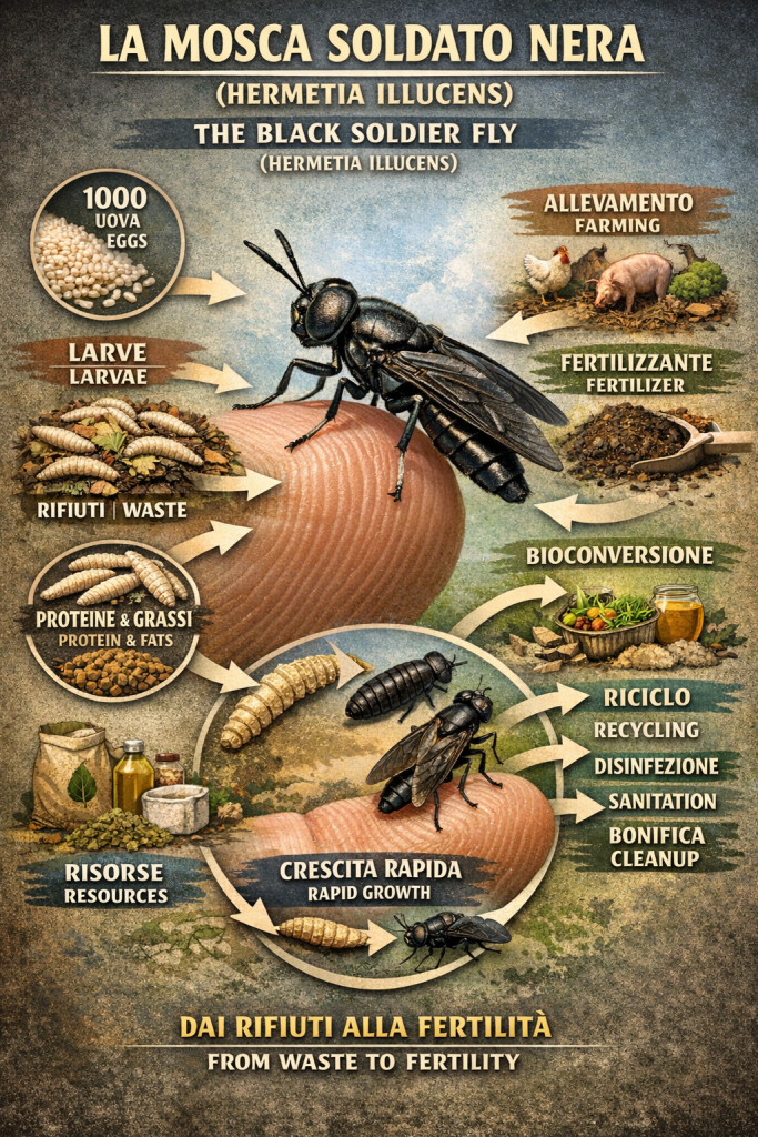 La mosca soldato nera è uno degli organismi più sottovalutati e allo stesso tempo più potenti della biosfera moderna. Piccola, silenziosa, quasi invisibile, questa mosca non punge, non disturba e non trasmette malattie. Eppure è capace di trasformare montagne di rifiuti organici in proteine, grassi, fertilizzanti e vita.