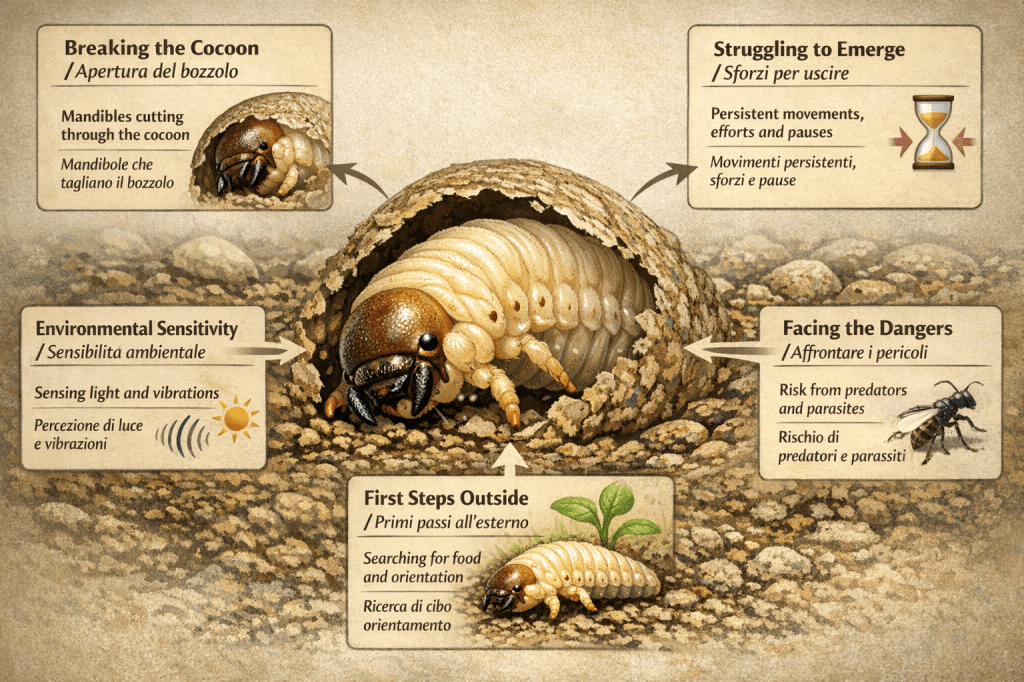 Una volta emerse, le larve affrontano un ambiente completamente nuovo. Iniziano a orientarsi, testando il substrato e cercando le prime fonti di cibo.
