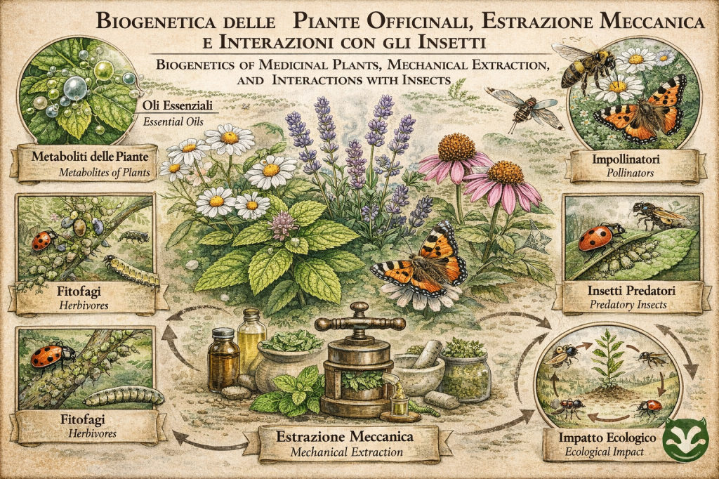 Le piante officinali rappresentano una combinazione unica di genetica, chimica e strategia ecologica. La loro biogenetica determina la produzione di metaboliti secondari — oli essenziali, flavonoidi, tannini e alcaloidi — che non solo svolgono funzioni difensive e attrattive, ma influenzano anche le interazioni con gli insetti. Comprendere queste dinamiche permette di collegare la scienza botanica alla pratica entomologica e all’uso umano attraverso l’estrazione meccanica di principi attivi.