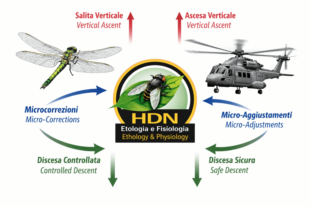 - Energia e resistenza / Energy and Endurance: Entrambi ottimizzano il consumo energetico; gli insetti con muscoli asincroni, l’elicottero con gestione della potenza del motore.