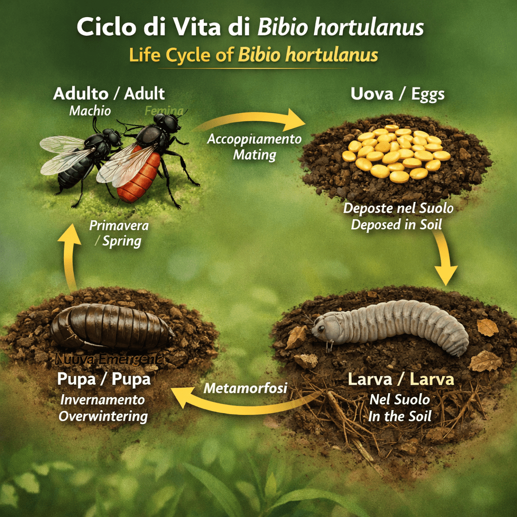 Bibio hortulanus is a perfect ecological model: a seemingly common insect that is fundamental for decomposition, nutrient cycling, indirect pollination, and food webs. Understanding its complete life cycle allows appreciation of the role of these small organisms in the health of gardens, meadows, and urban ecosystems.