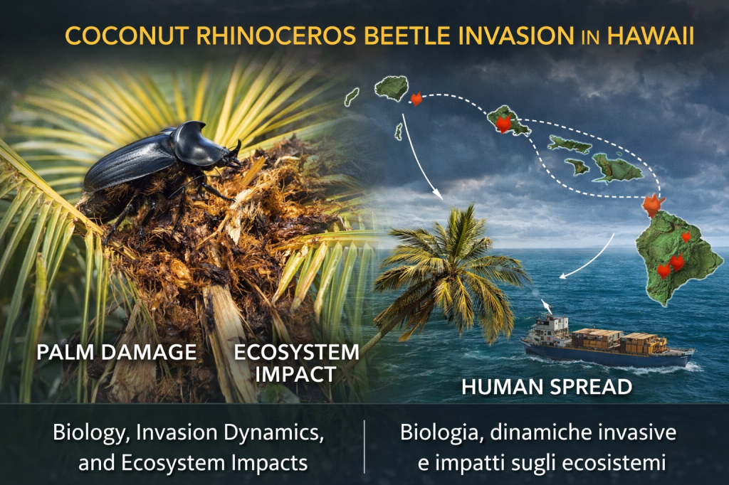 Nel panorama delle invasioni biologiche moderne, pochi organismi hanno dimostrato una capacità di alterazione degli ecosistemi paragonabile a quella del coleottero rinoceronte delle palme. Questo insetto, noto per la sua imponenza morfologica e per il suo comportamento distruttivo nei confronti delle palme, rappresenta oggi una delle minacce più concrete per gli ecosistemi tropicali e subtropicali, in particolare nelle isole oceaniche, dove l’equilibrio ecologico è spesso fragile e altamente specializzato. La recente segnalazione della sua presenza su nuove isole delle Hawaii evidenzia non solo la sua straordinaria capacità di dispersione, ma anche le criticità nei sistemi di monitoraggio e contenimento.