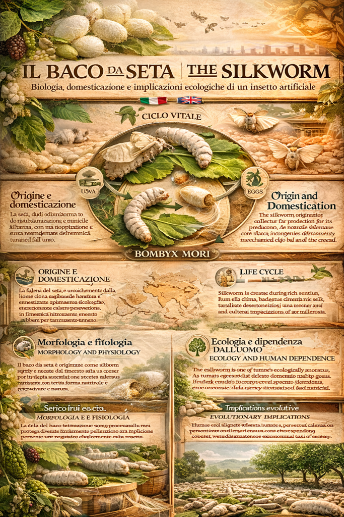The silkworm represents one of the most extraordinary examples of interaction between humans and insects, an organism that over millennia has been profoundly transformed through a process of domestication so radical that it has become entirely dependent on human intervention. The species Bombyx mori is not merely a farmed insect but a biological system optimized for the production of a material of immense value: silk. Studying this organism means exploring a crossroads between entomology, evolution, economics, and culture.