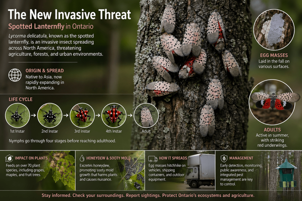 The insect shown in the image is Lycorma delicatula, commonly known as the spotted lanternfly. It is a planthopper native to East Asia and has become one of the most concerning invasive species in North America. Its presence in Ontario signals ongoing geographic expansion driven by climate, trade, and human activity.