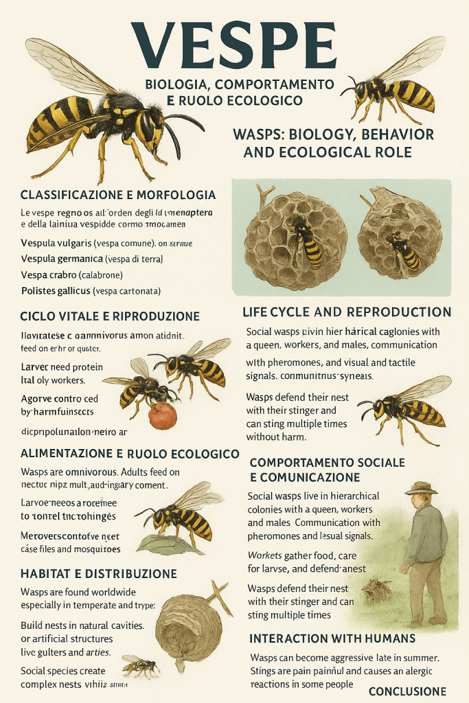 Le vespe, appartenenti alla famiglia Vespidae, sono imenotteri noti per il loro corpo snodabile e il pungiglione velenoso. Sebbene spesso considerate fastidiose durante l’estate, svolgono ruoli fondamentali nell’ecosistema come predatori di insetti dannosi e, in alcuni casi, come impollinatori. Wasps, belonging to the family Vespidae, are hymenopterans known for their segmented bodies and venomous stingers. Although often seen as a nuisance during summer, they play crucial roles in ecosystems as predators of harmful insects and, in some cases, as pollinators.