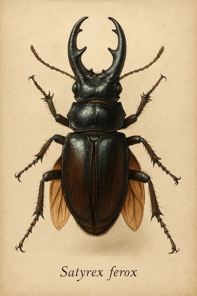 Adult specimens of Satyrex ferox can reach lengths between 14 and 20 centimeters, with a robust, segmented body covered by an iridescent cuticle that ranges from metallic black to reddish bronze. Its bifurcated horn-like cephalic appendages are highly developed and serve as effective tools for both defense and intra-specific competition. Membranous wings, present in many adults, allow for rapid and agile flight in confined spaces, while the powerful forelegs are equipped to grasp and immobilize prey. The asymmetrical mandibles are reinforced and capable of crushing exoskeletons of other species and fibrous tissues, making Satyrex ferox an opportunistic and versatile predator.