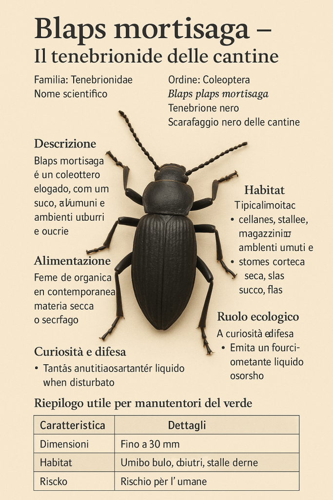 Blaps mortisaga è un coleottero notturno appartenente alla famiglia Tenebrionidae. Ha un corpo allungato, di colore nero opaco o marrone scuro, con tegumento coriaceo e riflessi metallici. Può superare i 25 mm di lunghezza. Le elitre sono saldate e scanalate, e non coprono completamente l’addome.